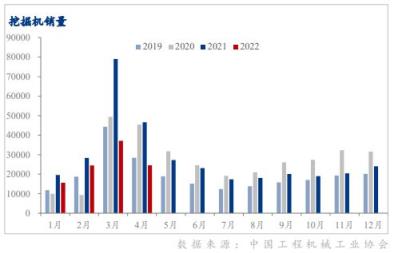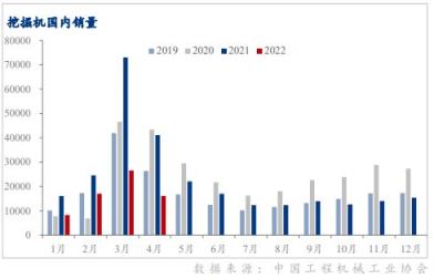 受疫情持续影响、房地产和基建工程开工率低迷等因素影响, 4月份工程机械的核心代表挖掘机销售量同环比双降。