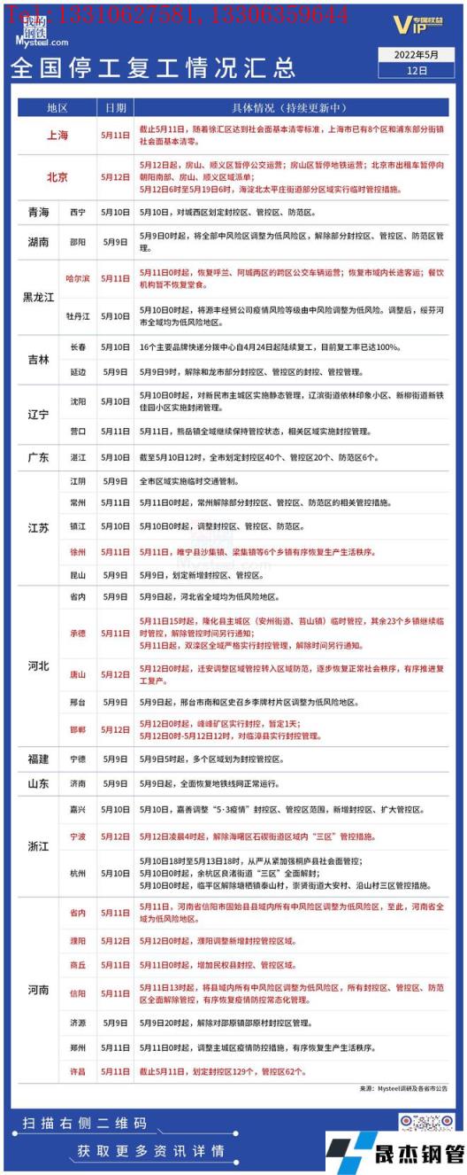 截至5月12日,据不完全统计,共有14个省份发布了停工复工最新信息。5月12日起,北京房山、顺义区暂停地面交通运营。河南全域均为低风险地区。唐山迁安有序推进复工复产。具体情况如下: