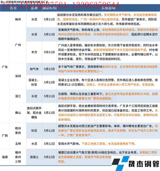 今年以来最强降雨过程已经在华南拉开帷幕。据气象水文部门预测,5月9日至13日江南南部和华南地区将迎来入汛以来最强降雨过程,本轮强降雨覆盖范围广、持续时间长、累计雨量大、局地雨势猛,广东、广西、福建、重庆、四川、贵州、云南省(自治区、直辖市)等多地启动防汛Ⅳ级应急响应,部分强降雨天气影响下多地施工进度受损,运输和终端施工进度受限,建筑材料市场行情弱势运行。