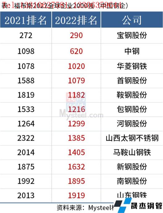 5月12日,福布斯2022全球企业2000强发布。据统计,中国钢铁行业共有12家企业上榜。分别是宝钢股份、中钢、华菱钢铁、首钢股份、鞍钢股份、包钢股份、河钢股份、山西太钢不锈钢、马鞍山钢铁、新钢股份、南钢股份和山东钢铁。具体排名如下:
