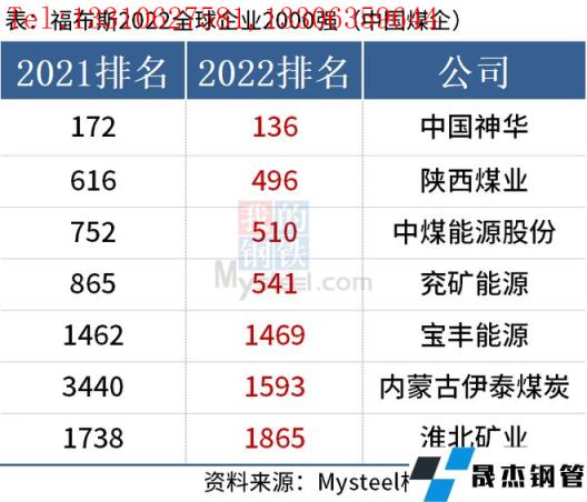 5月12日,福布斯2022全球企业2000强发布。据统计,中国煤炭行业共有7家企业上榜。分别是中国神华、陕西煤业、中煤能源股份、兖矿能源、宝丰能源、内蒙古伊泰煤炭和淮北矿业。具体排名如下:
