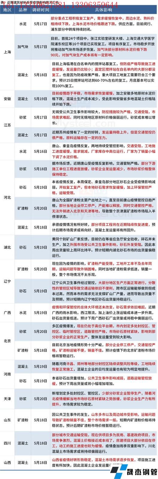 截至5月20日,据百年建筑网调研,13个省份建材市场受到了不同程度的影响。随着华东、华南疫情和暴雨情况的缓解,物流运输逐步恢复正常,材料进场速度加快,下游工地施工节奏提升。在疫情有效管控下,基建、房建方面的需求陆续回升,但由于疫情反复抬头的影响,仍有上行空间有限。具体情况如下: