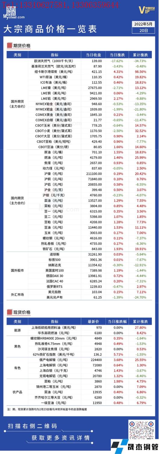俄乌局势丨大宗商品价格一览表(5月20日)
