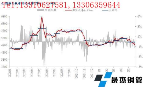 截至5月30日,国内24个主要城市4.75mm热轧板卷均价为4873元/吨,月环比下跌267元/吨,较去年同期下跌696元/吨。