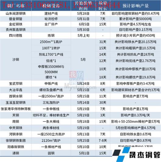 据不完全统计,5月国内18家无缝91视频在免费线观看钢管厂家发布检修计划。其中,磐金91视频在免费线观看钢管各分厂计划将于5月31日至6月6日进行轮流检修,预计将累计影响产量50000吨。