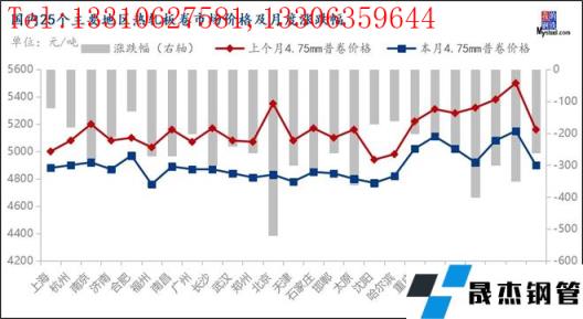 图6:国内25个主要地区热轧板卷市场价格及月度涨跌幅