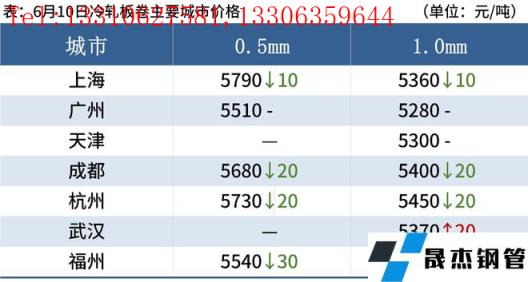 冷轧板卷:6月10日,全国24个主要城市1.0mm冷卷均价5427元/吨,较上个交易日下跌8元/吨。大部分市场商家信心不足心态偏悲观仍然选择调低报价以出货回笼资金的操作为主。据商家反馈,当前下游制造业接单状况一般,观望心态较重,按需采购为主,今日成交整体一般。综合来看,故预计下周国内冷轧板卷价格或将震荡偏弱运行。
