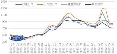 5月份,海外无缝钢管 91视频在免费线观看钢管市场供需形势得以改善,主要出口国家大幅下调无缝钢管 91视频在免费线观看钢管出口报价。进入6月份,印度加征出口关税一定程度提振了热卷价格,各国出口报价基本稳定,云商平台监测数据显示,2022年6月8日,印度、土耳其、独联体和中国热轧卷板出口报价(FOB)分别为850美元/吨、820美元/吨、740美元/吨和740美元/吨,与5月底基本持平。