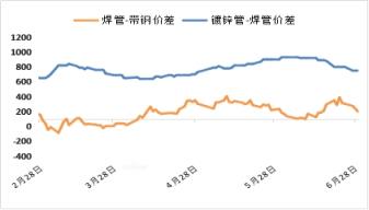 6月焊管较带钢价差由月初收至零轴后重新走扩,目前管厂厂内原料轮换周期拉长至15天左右,结算周期内焊管生产利润平均亏损139元,架子管平均亏损129元;镀锌管较焊管价差扩大96元,综合生产利润有所改善,但整体仍处亏损边缘。