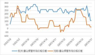 图3 2022年杭州-唐山、沈阳-唐山焊管价差走势图