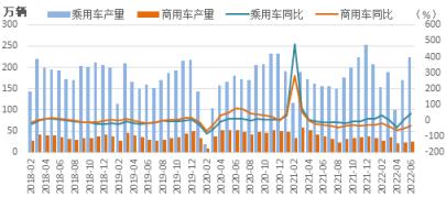 图2 2017-2022年乘用车和商用车月度产量及同比增速