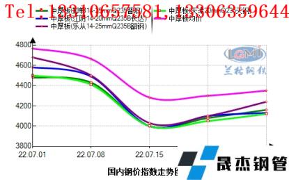 综合来看,7月份国内中厚板市场价格整体呈现先抑后扬的格局。截止7月29日,重点区域邯郸价格为4160元/吨,环比下跌340元,江阴价格为4610元/吨,环比下跌450元,天津4120元/吨,环比下跌390元,乐从4240元/吨,环比下跌490元,目前样本十大重点城市均价为4216元/吨,环比下跌434元左右。