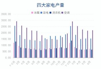 1-6月份,冰箱产量4164.2万台,同比下降6.2%;彩电产量8986.4万台,同比增长5.8%;洗衣机产量4113.3万台,同比下降4.1%;空调产量12248.9万台,同比增长1.1%。