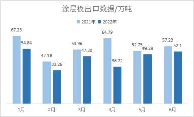 2022年6月我国镀层板(带)出口总量共计124.86万吨,月环比降幅5.82%,年同比降幅20.33%;2022年上半年我国镀层板(带)出口总量共计657.43万吨,年同比降幅15.98%。